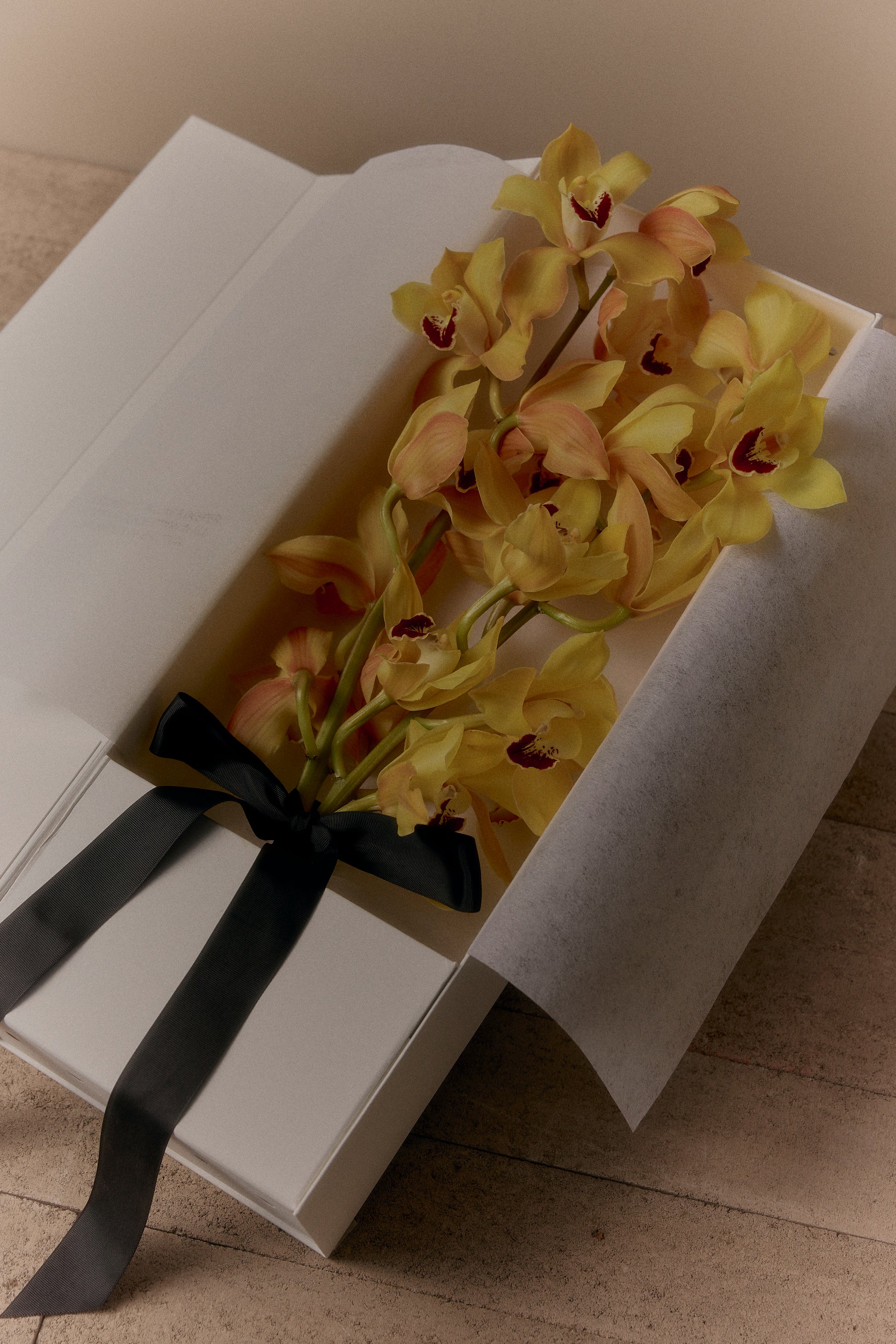 Our flowers are beautifully presented in our signature premium white box, finished with a grosgrain ribbon. By default, arrangements are tied with our classic black ribbon. You may also choose a white ribbon or opt for a coloured ribbon in a shade that corresponds harmoniously with your floral selection. Each order includes a personalised notecard.