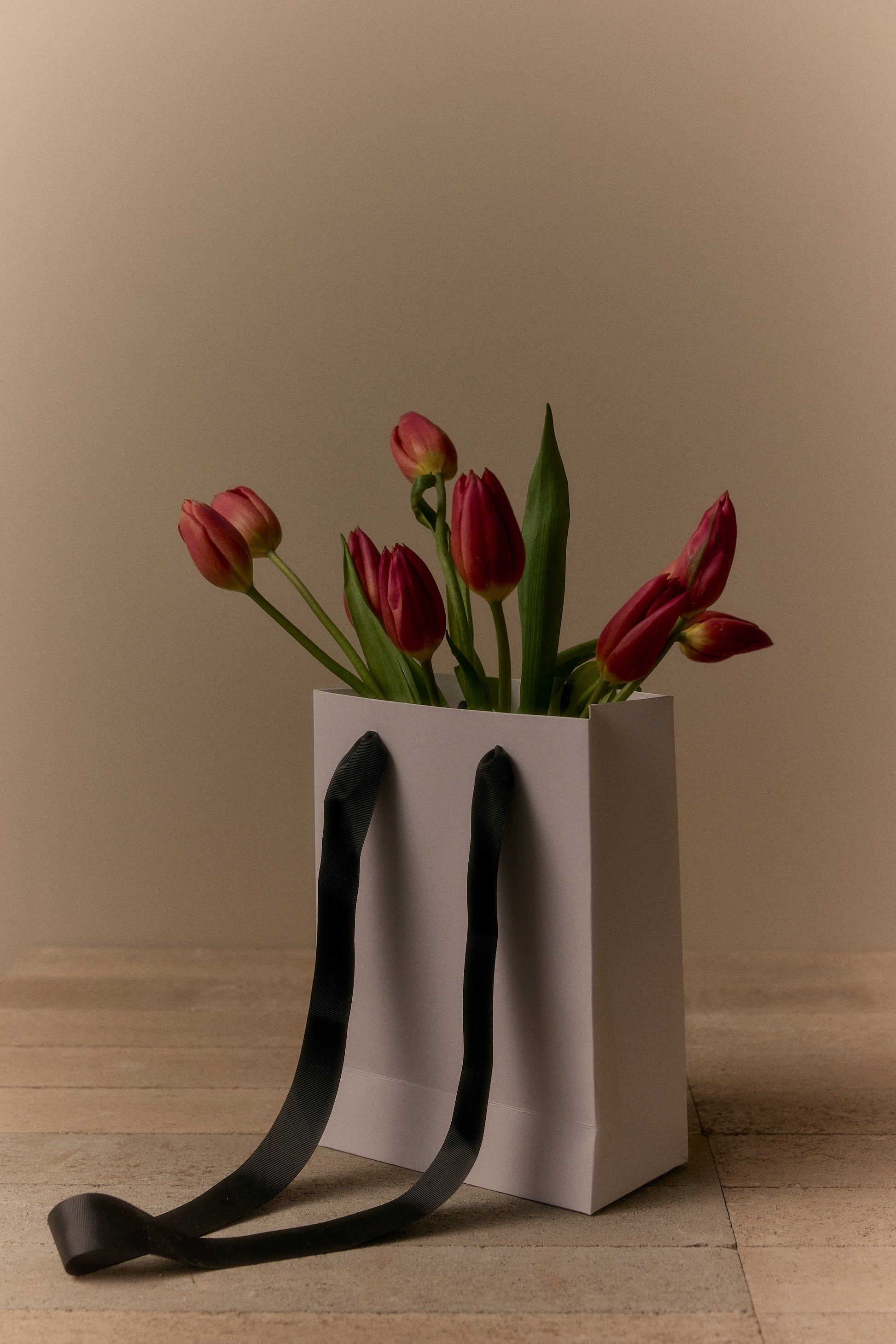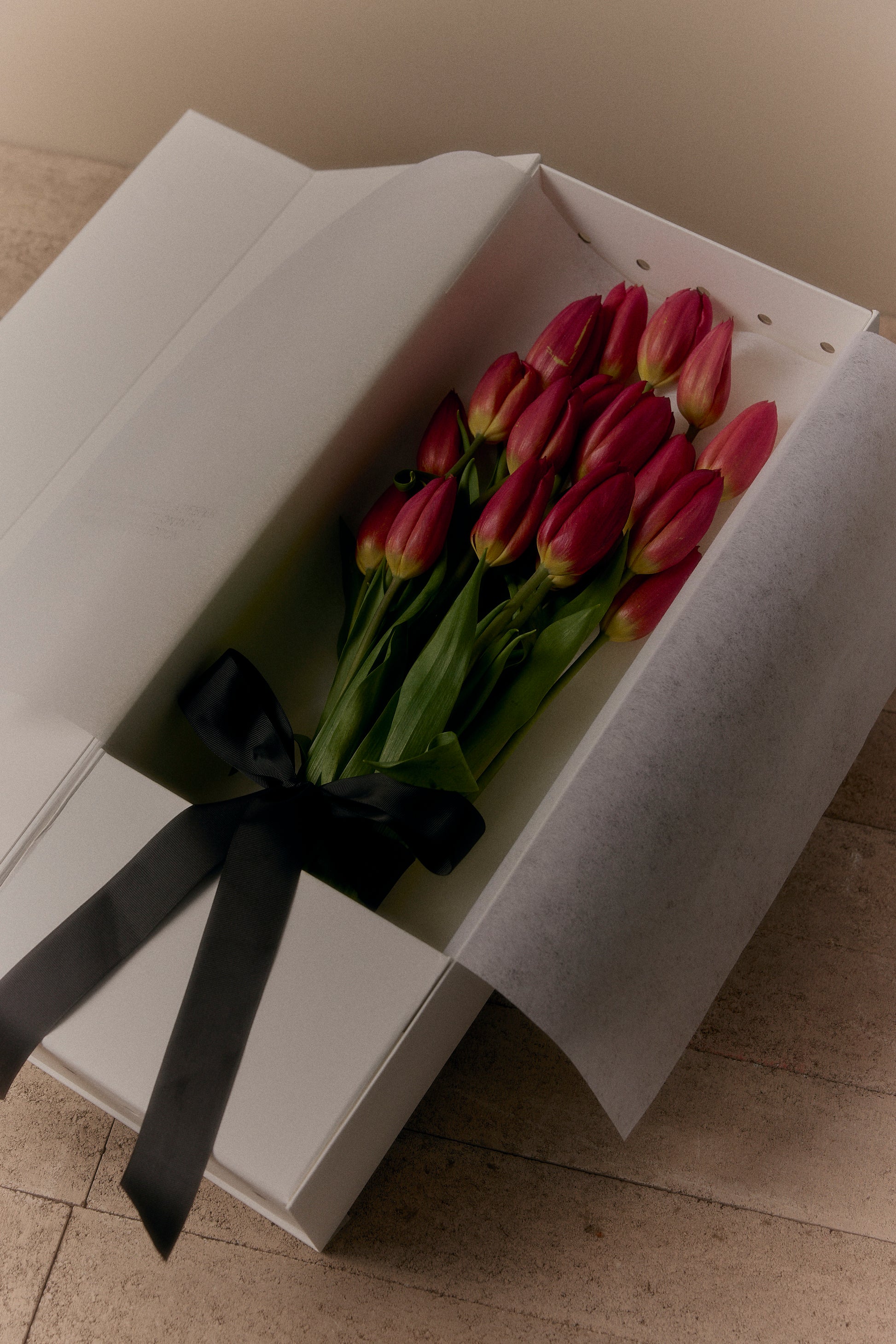 18 stems of tulips will be in our signature premium white box, finished with a grosgrain ribbon. By default, boxed flower arrangements are tied with our classic black ribbon. You may also choose a white ribbon or opt for a coloured ribbon in a shade that corresponds harmoniously with your floral selection.